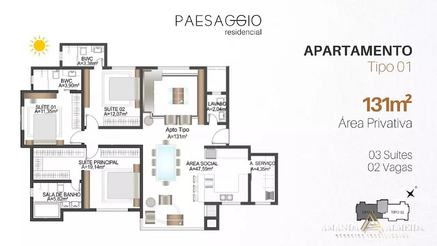Características da unidade: São 131m² de área privativa, contemplados por um amplo living integrando sala de estar e jantar com a cozinha, varanda gourmet e churrasqueira à carvão. Possui 03 suítes sendo 01 master com closet e infraestrutura para banheira.